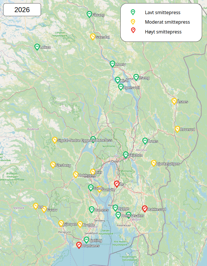 Kartet viser et antatt lavt til moderat smittepress av Fusarium-sopper som produserer mykotoksinet deoksynivalenol (DON) denne vekstsesongen. Risikoen for at havre som er dyrket på østlandsområdet kan ha et høyt nivå av DON er dermed redusert i forhold til de to foregående åra (2024 og 2025). Nytt varsel vil bli publisert i juni 2026. For å vurdere et eventuelt behov for fungicidbehandling mot Fusarium i kornets blomstringsperiode må dyrkerne i tillegg legge til grunn faktorer som forgrøde, jordarbeiding, havresort og værprognose for perioden rundt blomstring (se ytterligere informasjon her).